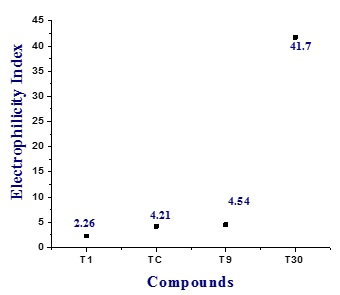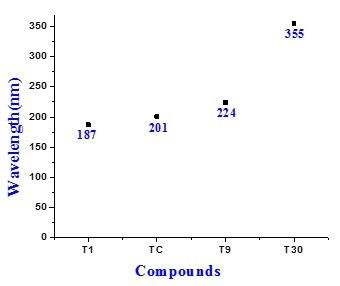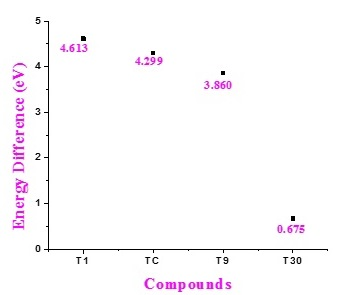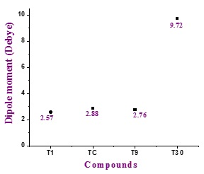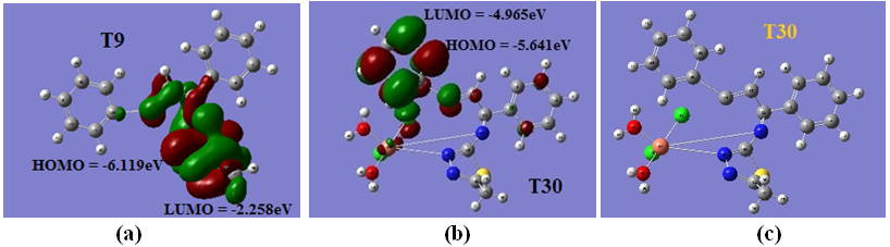 To establish the expected structure of synthesized ligands and their metal complexes, DFT study of the novel synthesized complexes (T1, TC, T9 and T30) were performed to study for (i) comparison of wave numbers (ii) optimized structural geometry (iii) frontier orbital with energy differences (iv) Dipole moment and wavelength. The experimental wavenumbers for these complexes (T1, TC, T9 and T30) are comparable with the computed wave numbers (fig. 2). These wavenumbers exhibit bathochromic and hypsochromic shifts of complexes in functional group regions as shown in fig. 3(a, b). The optimize structure of ligand and its Cu complex corresponding to frontier contours was given in fig. 3(c). There is an increase in dipole moment and moment of inertia (table 4) from T1 to T30 and energy gap is reduced indicating the ability of ease of bonding activity and structure indicates the high donor activity.