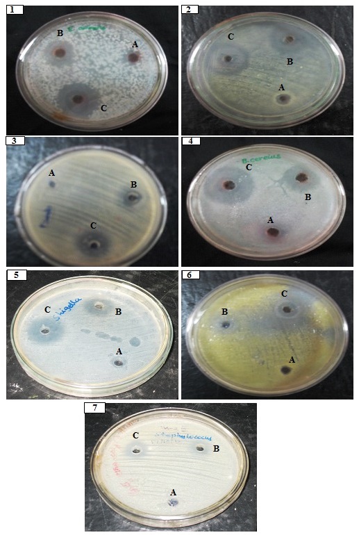 Fig. 2: Antimicrobial activity of crude extract of M.anisoliae on (A) 25µl (B) 50µl,(C) 75µl, against human pathogenic bacteria (1) Entrococci spp,,(2) E.coli, (3) Pseudomonas spp (4) B.subtilis,(5) Shigella spp,(6) Proteus spp, (7) S.aureus