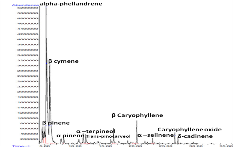 The analysis of oil was performed using gas chromatography-mass spectrometry (GC-MS). In total, ten volatile constituents, representing 92.7% of the oil, were identified in the leaf oil (Table 1). The most abundant components found in the leaf oil were α-phellandrene (43.9%) followed by β-cymene (31.7%), β-pinene (4.6%) (Fig-1). The major compound (α-phellandrene) obtained in this study was also found to be the major compound of the essential oil obtained from leaves of Alpinia malaccensis growing in Bangladesh [4].