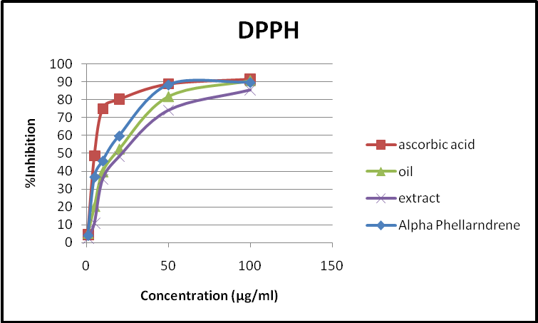 Radical scavenging activity of the leaf essential oils, major compound of oil α-phellandrene from sigma Aldrich (W285609 Aldrich) and methanolic leaf extract of Alpinia malaccensis were determined by a spectrophotometric method based on the reduction of a methanol solution of DPPH using the method of Blois with little modification [15]. 1 ml of various concentrations of oil and extract in methanol was added to 2 ml of 0.1 mM methanol solution of DPPH. The mixture was shaken vigorously and left to stand at room temperature for 30 min in dark. Then the colorimetric changes (from deep violet to light yellow), when DPPH is reduced, were measured at 517 nm on a uv/visible spectrophotometer. Absolute methanol was used to zero the spectrophotometer. The DPPH solution was freshly prepared daily, stored in a flask covered with aluminium foil and kept in the dark. Tests were carried out in triplicate. Vitamin C (Ascorbic Acid), a standard antioxidant was used as positive control. Absorbance of the DPPH radical without antioxidant, the control, was measured. Special care was taken to minimize the loss of free radical activity of the DPPH radical stock solution.