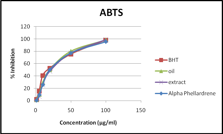 The leaf oils and extract of A. malaccensis were fast and effective scavengers of the ABTS radical (Fig-3). The oil, α-phellandrene and extract exhibited potent scavenging effects against ABTS with an IC50 value of 20 μg/ml, 20 μg/ml and 26.23 μg/ml respectively which is almost equivalent to that of standard BHT (IC50 value 19.47 μg/ml).
