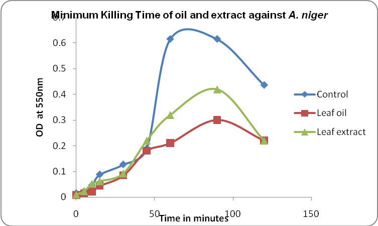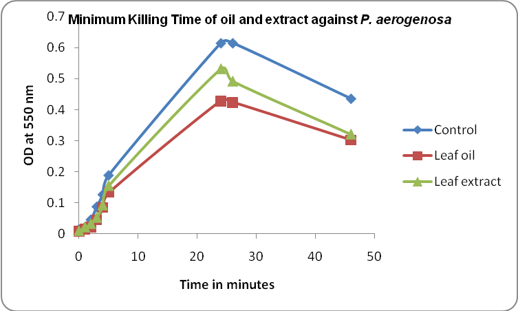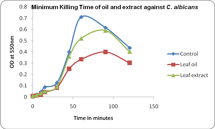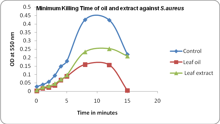 This experiment was designed to determine the time required to kill the bacteria and fungus in-vitro by the oil and extract. One ml of NB, supplemented with 0.75% of DMSO and one ml of PDB supplemented with 0.75% of DMSO at MIC level of both samples were prepared and inoculated with 0.1 ml of freshly grown test organisms and incubated at 37°C. One loop of the sample from the above test tubes were sub cultured onto NA plates at 0, 5,10,15, 30,45, 60, 90, 120, 180 min. intervals and incubated overnight. Two sets of tubes were incubated for each test organisms from which sub-culturing were carried out alternatively (to avoid time lapse during subculture).