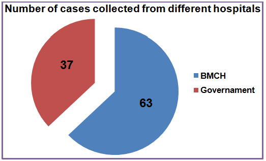 In the present study, 100 cases of either sex were collected, of which 63% (n=63) were obtained from BMCH and RC and the remaining 37% (n=37) from Government hospital. Fig. 1 represents, in the form of a pie chart, the number of cases procured from both the hospitals.