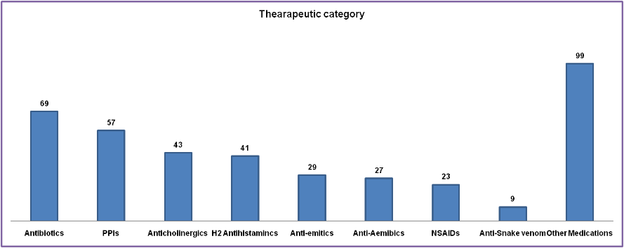 In this study, 397 drugs were prescribed other than IV fluids. The average number of drugs per prescription was found to be 3.97. The drugs most commonly given included antibiotics, PPIs, anti-cholinergics, H2 antihistaminics, anti-emetics, anti-amoebics, NSAIDs, anti-snake venom and others.
