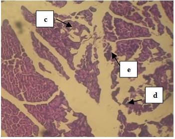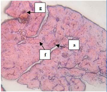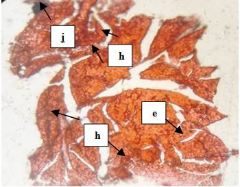 Fig. 1: Histoarchitecture of pancreas tissue treating with drug and test extracts, (a) clear islet boundaries (b) islet cells clearly visible, (c) destructed cells (d) destroyed central lobes, (e) fatty degeneration (f) restored cellular integrity, (g) partial necrosis (h) coagulation due to necrosis, (i) Slight cell ballooning (j) blood clotting or necrosis, (k) Cell ballooning