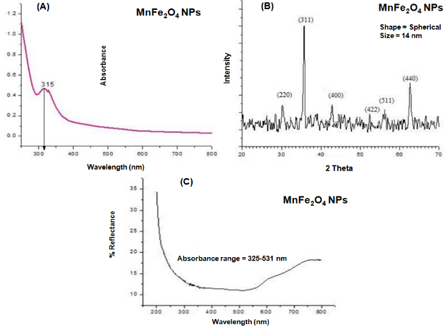 Fig. 1: (A) UV-Vis absorbance spectra of MnFe2O4 NP. The characteristic absorption peak at 315 nm demonstrates the presence of synthesized metal oxide NPs. (B) XRD pattern of MnFe2O4 NP. The average particle size was determined to be 14.2 nm from full width at half maximum with a spherical shape. (C) Diffused reflectance spectra of MnFe2O4 NP