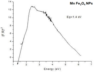 Fig. 2: Band gap energy of MnFe2O4 NPs through Kubelka-Munk function by treating their diffuse reflectance spectra. A bandgap of 1.4 eV highlights that the NPs can be excited through infrared radiation