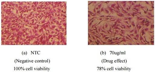 Fig. 4: Cell viability observed under inverted microscope: (a) Cells without NPs/drug treatment and (b) Cells treated with 70 µg/ml of NPs dispersion