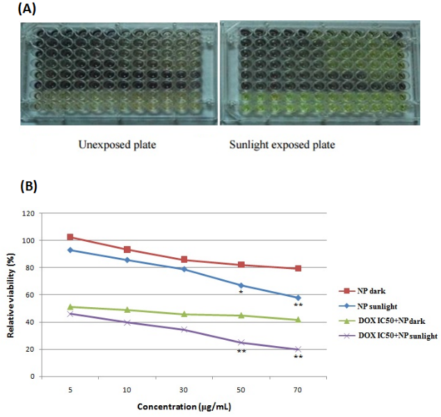 Fig. 5: (A) Photo-mediated cytotoxicity following sunlight exposure. HeLa cells were treated with different concentrations (5, 10, 30, 50, 70 μg/ml) of NPs and fixed concentration of doxorubicin (DOX) 25μM (IC50) in dark and sunlight, (B) Cell viability curve plotted between % viability and concentration (ug/ml) in dark and sunlight. Significant photo-mediated cytotoxicity was observed in case of NPs at concentrations 5, 10, 30, 50, 70 μg/ml after sunlight exposure