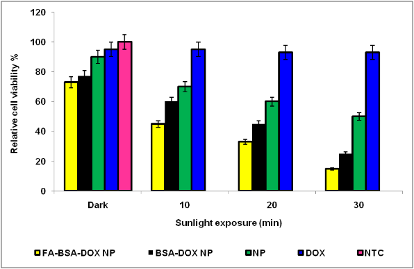 Fig. 6: Relative cell viability studies as a function of sunlight exposure time. The concentration of doxorubicin (DOX) was kept constant (500nM) while being treated alone and in conjugation with nanoparticles. Data showed that sunlight exposure did not bear any effect on the viability of NTC nor on DOX-treated cells; however, a significant decrease in cell viability was observed in cells treated with folic acid-conjugated doxorubicin-loaded bovine serum albumin NP (FA-BSA-DOX NP) and in the case of doxorubicin-loaded bovine serum albumin NP (BSA-DOX NPs). Data is presented as mean±S. D (n =3)