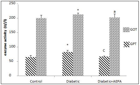 Fig. 1: Glutamate-oxaloacetate transaminase (GOT) and glutamate pyruvate transaminase (GPT) activities of control and experimental animals.*p<0.05: significantly different from control group. a p<0.05, c p<0.001: significantly different from the diabetic group. Values are mean±SEM; n=06
