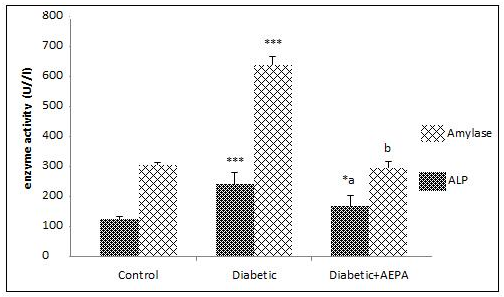 Fig. 2: Alkaline phosphatase (ALP) and amylase activities in serum of control and experimental animals. *p<0.05, ***p<0.001: significantly different from control. a p<0.05, b p<0.01 significantly different from diabetic. Values are mean±SEM; n=06