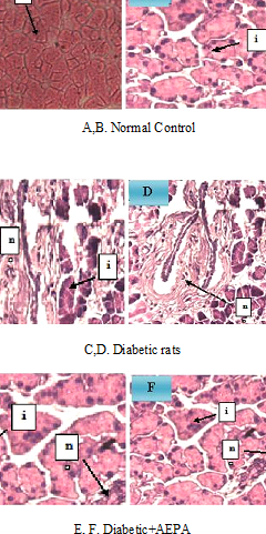 Fig. 3: Effect of aqueous extract of rhizome Phragmites australis on pancreas in alloxan–induced diabetic rats, fig. 3 Histology of the pancreas following induction of diabetes mellitus and treatment with P. australis rhizome extract in rats. (A,B) normal controls with normal Islet; (C,D) untreated diabetic group with congestion of vessels and focal area of necrosis and (E,F) diabetic treated with 200 mg/kg P. australis with moderate congestion of vessels, islets appear normal but few and small in size. Histologic slides were stained with hematoxylin and eosin (×400)