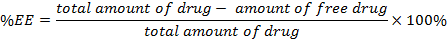 The entrapment efficiency (EE) and drug loading (DL) was indirectly determined by measuring the concentration of free exemestane in the lower chamber of centrifugal filter tubes with a molecular weight cut-off of 3500 Da (Amicon Ultra 0.5 ml, Merck Millipore, Germany). About 400 µl of NLCs suspension was placed in the upper chamber of centrifugation tube, followed by centrifugation at 30000 x g (Hermle, Z36HK, Germany) at 20 °C for 15 min [18]. The free exemestane in the filtrates was analyzed by an HPLC analytical method described aforementioned. The studies were performed in triplicate. Entrapment efficiency and drug loading were calculated by the following equations: