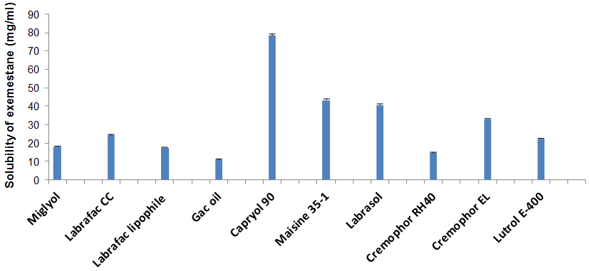 Fig. 3: Solubility of exemestane in liquid excipients at 25 °C. The values represented mean±SD (n=3)