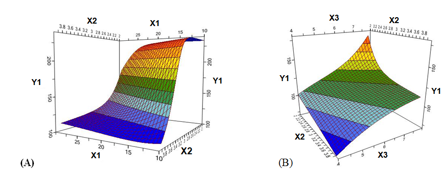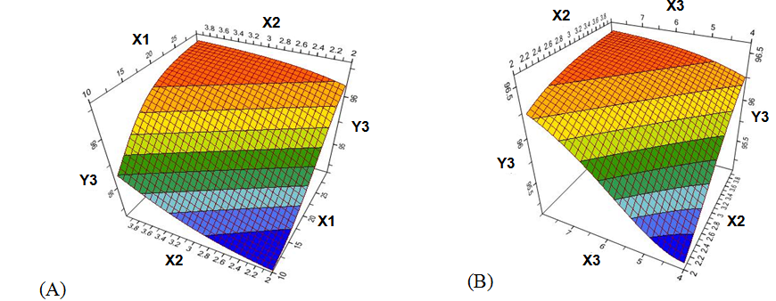 The three-dimensional (3D) response surface plots were used to study the interaction effects of two independent variables on the dependent variables at one time when the third variable was kept at a constant level.