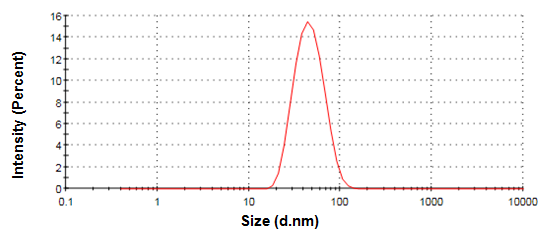 The optimized EXE-NLC formulation was achieved with 24 % (w/w) liquid lipid to total lipid ratio, 4 % (w/v) surfactant concentration and 4 % (w/v) total lipid concentration. Three replicated batches of the optimised EXE-NLC formulation were prepared to confirm the validity of the optimization procedure. The EXE-NLCs showed a narrow size distribution (fig. 8). Particle size, polydispersity index, entrapment efficiency and drug loading of the optimized EXE-NLC formulation were found to be at 41.787±1.282 nm, 0.110±0.008, 97.605±0.503 % and 1.935±0.018 %, respectively.