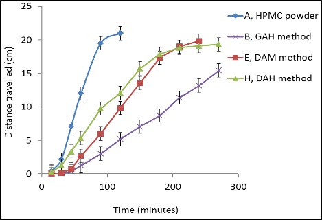 The dynamic adhesion of processed HPMC microparticles was higher than for HPMC powder. This suggests that the process of dropping or mixing HPMC aqueous gel directly into acetone and subsequent drying produced this increase in the bioadhesive effect. However, particle size and morphology may also play a role, since the above studies compare discrete particles of HPMC powder, with aggregated materials produced on processing. The dropping technique (GAH) applied in formulation B resulted in higher in-vitro bioadhesionin comparison to the other two methods of precipitation DAM (formulation E), and DAH (formulation H).