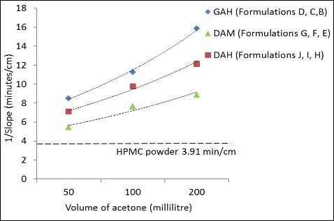 | Formulations | HPMC forms | Precipitation method, 200ml acetone | 1/Slope (min/cm) | Regression (r²) |