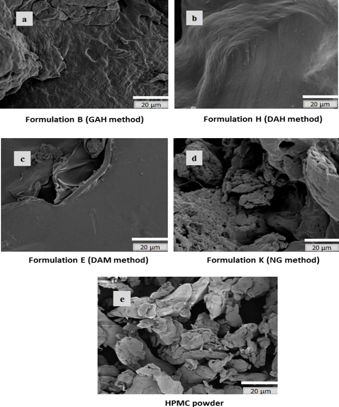 While mixing of HPMC aqueous gel with acetone (non-dropping) using M stirrer (DAM method), produced a smooth sheet like structure as shown for formulation E. HPMC microparticles (formulation K) which involved the addition of acetone directly to HPMC sprinkled on water (NG method) using M stirrer produced a little difference in places by maintaining a more open polymer structure as unprocessed HPMC powder.