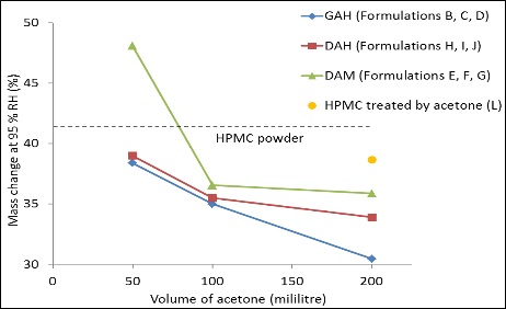 Equally important are the data points for 200 ml acetone of formulations B (GAH method), E (DAM method) and H (DAH method), where the effect of processing on vapor sorption capability of the particles are striking, and the previous “water history” of HPMC appears to dictate the capability to uptake moisture. For example, direct addition of acetone to HPMC powder (formulation L, DAM method) reduces its vapor sorption potential in comparison to unprocessed HPMC powder.