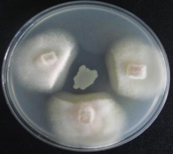 Fig. 2: Inhibition of the growth of F. oxysporum by strain JD-09 on potato dextrose agar (PDA) medium containing 0.5% of colloidal chitin at 28ºC for 3 days.