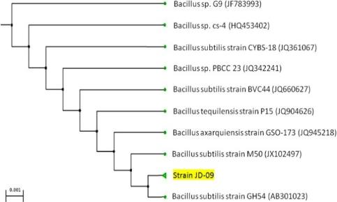The genomic DNA of the strain JD-09 was amplified with universal primers and 16S rRNA gene sequence was analyzed. Alignment of this sequence (838) through matching with reported 16S rRNA gene sequences in the Genbank showed high similarity (99 to 100%) to Bacillus subtilis sp. The phylogenetic tree determined by the Neighbour-joining method showed that Bacillus sp. and B. subtilis were most closely related to strain JD-09 (Fig. 3).