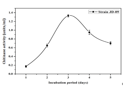 B. subtilis JD-09 was investigated for the production of extracellular chitinase in CC broth by spectrophotometry. At 24 h intervals, aliquots of cell cultures were taken, and the chitinase activity was determined by standard method. The results from culture filtrate of strain JD-09 exhibited maximum chitinase activity of 1.33 U/mL after 3 days of cultivation and gradually decreased thereafter (Fig. 4).