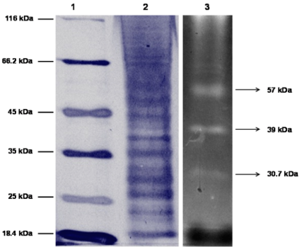 Lanes 1 and 2 were obtained from SDS-PAGE of Coomassie brilliant blue R-250 where lane 1 is molecular weight (MW) of standard markers in kilodaltons (kDa), and lane 2 is purified chitinase sample. Lane 3 indicates zymogram demonstrated by copolymerizing 0.1% of glycol chitin.
