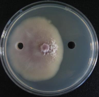 Fig. 6: Antifungal activity of chitinase against F. oxysporum by well diffusion assay on potato dextrose agar (PDA) at 30 °C for 5 days. Right well was loaded with chitinase and the left well loaded with same volume of buffer.