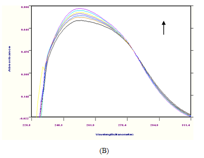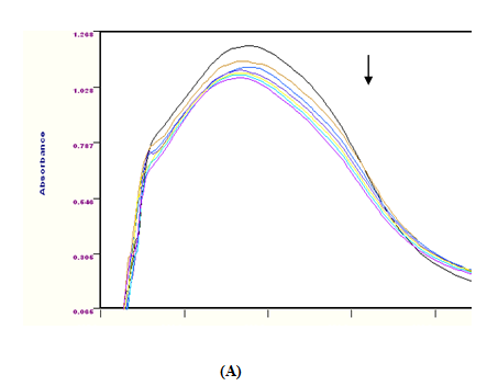 The interaction of p-TEBHA and o-TEBHA with CT DNA has been studied with UV spectroscopy in order to investigate the possible binding modes to CT DNA and to calculate the binding constants to CT DNA (Kb). The absorption spectra were recorded for fixed concentration of p-TEBHA and o-TEBHA with increasing concentration of DNA. A “hyperchromic effect” was observed for increasing concentration of DNA as shown in Fig.1.