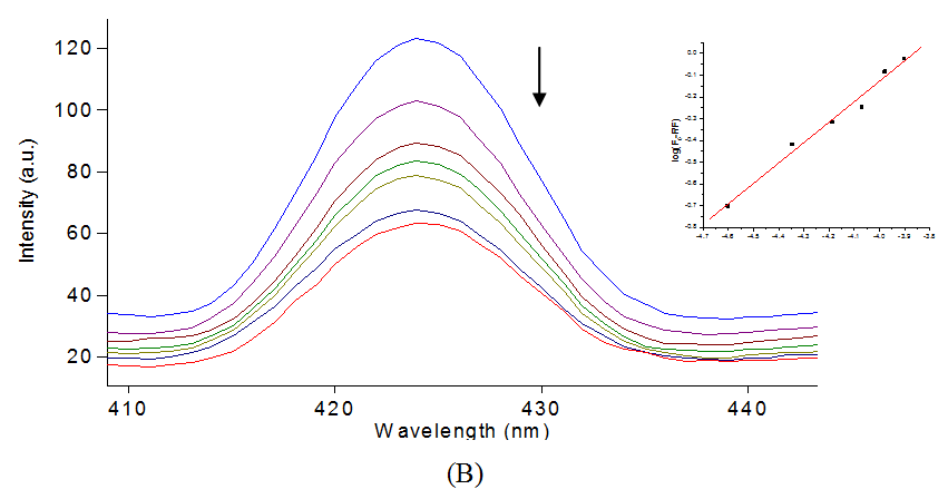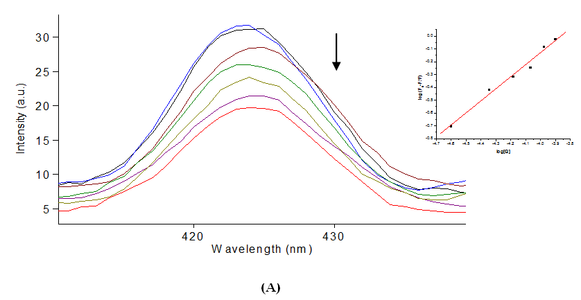 Fig. 2: The fluorescence spectral intensity of (A) p-TEBHA and (B) o-TEBHA in DMSO solution (50 µM) in the presence of CT DNA (in 5 mM Tris–HCl buffer at pH 7.4) having Concentrations (µl), (a) 0.00 (b) 25 (c) 45 (d) 65 (e) 85 (f) 105 (g) 125 at 298.15 K. The arrows show the hypochromic for (A) and (B) changes due to interaction of hydroxamic acids with CT DNA. Inset Plot of log [Q] versus log (F0-F)/F.
