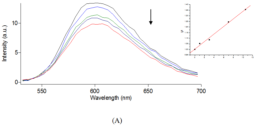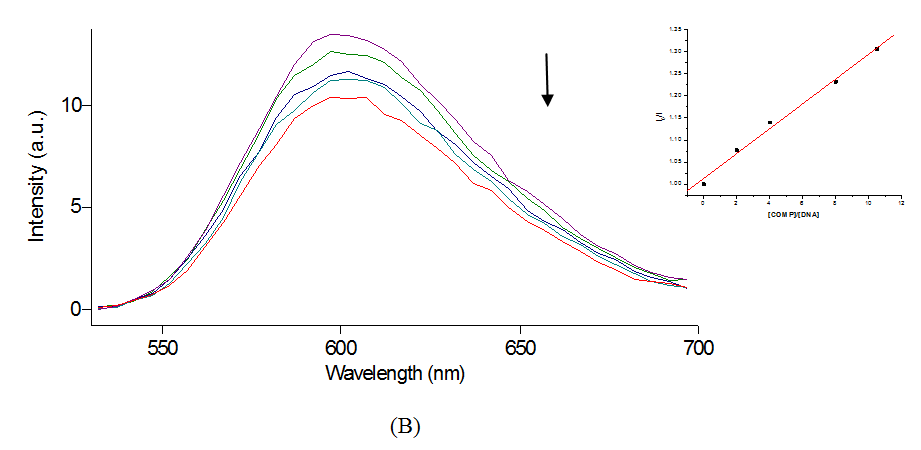 Fig. 3: Emission spectra of EB bound to DNA in the presence of (A) p-TEBHA and (B) o-TEBHA in 5 mM Tris–HCl buffer at pH 7.4. The arrows show the intensity changes upon increasing concentrations of the hydroxamic acids. Inset plots of I0/I vs. [Compound]/[DNA] for experimental data points and full line for linear fitting of the data.