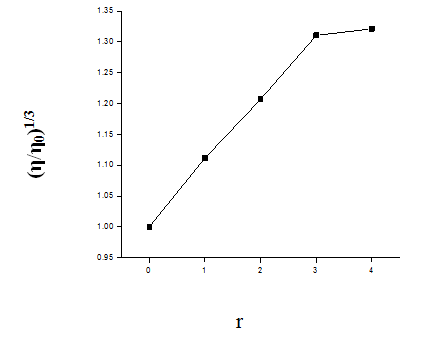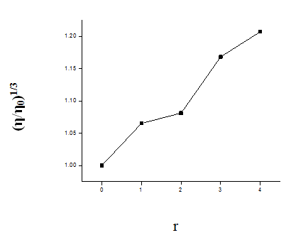 Fig. 4: A linear increase in relative viscosity of CT DNA (η/ηo)1/3 in buffer in 5 mM Tris–HCl at pH 7.4 in the presence of (A) p-TEBHA and (B) o-TEBHA at increasing amounts (r) at 298 K.