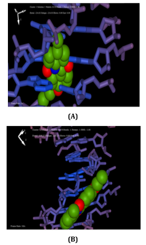 Fig. 5: Docked structure of p-TEBHA (A) and o-TEBHA (B) with calf-thymus DNA.