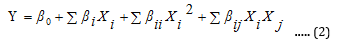 Where Y represents response variables, β0 is the interception coefficient, βi coefficient of the linear effect, βii, the coefficient of quadratic effect and βij, the coefficient of interaction effect.