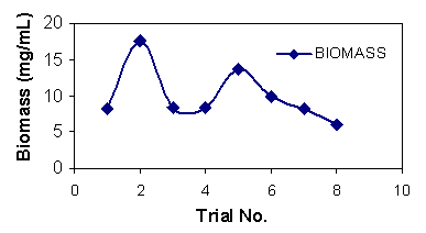 For each trial carried out experimentally by the Plackett Burmann design for the different combination of high and low values, biomass were determined. Trial 2 recorded highest biomass weight (17.7 mg/mL) while trial 8 has lowest biomass weight (6 mg/mL) [17-18]. The values were shown in Table 2 and data were analyzed graphically in figure 2.