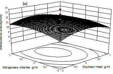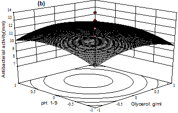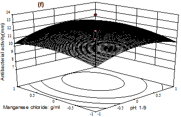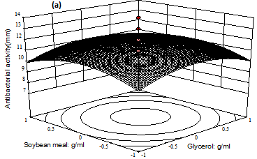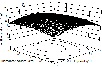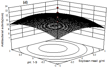 There is a 38.03% chance that a lack of fit has occurred and this could be due to noise. Non-significant lack of fit is good for an apt model showing excellent optimization [22-23]. Response surface contour plots and their three dimensional graphs are employed to understand the relationship between the response and experimental values of each variable. These plots also showed the type of interaction between test variables and helped to obtain the optimum conditions [24]. A total of six response surface plots were obtained by the central composite design. Maximum zone of inhibition showing the antibacterial activity (12.09 mm) was found during the interaction of soybean meal and Glycerol by fixing the quantity of manganese chloride and pH (Fig.1a). The antibacterial activity was observed in terms of the zone of inhibition, 10.78 mm as shown in the Fig.1b at pH 7 and glycerol (10g/mL). Similar values of the inhibition zone were observed during the interaction of Manganese chloride (1g/mL) and glycerol (10g/ml). The zone of inhibition was 10.67 mm during this interaction (Fig.1c). A comparable inhibition zone of 12.01 mm (Fig.1d) was obtained at pH 7 and soybean meal (10g/ml),