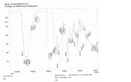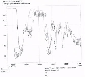 FT-IR spectroscopy was carried out to study the compatibility of pure drug cefuroxime axetil (CA) with the polymer Pluronic F127 (F127) and Pluronic F108 (F108) used in the formulation of sol gels. The pure cefuroxime axetil has characteristic IR peaks at 1670.35 cm-1 (C=O stretch), 1782.23 cm-1 (C=O cyclic) and 3446.79 cm-1 (N-H stretch) as depicted in Figure 6. The peaks for C=O (carbonyl) and C-H (non-aromatic) are found in the range of 1444.68 – 1502.55 cm-1 and 2812.21 – 2976.16 cm-1 respectively.