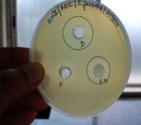 Fig. 7: It shows zone of inhibition of formulation F3 (FD), placebo formulation (F) and 1% drug solution in PEG 400 (D) against P.gingivalis on Day 1 and Day 5 respectively.