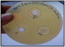The measurement of zone of inhibition was done by well plate method. For S.mutans and E.faecalis BHI broth was used whereas for P.gingivalis the BHI was supplemented with hemin and Vit. K. Optimized formulation F3 (FD), formulation without drug (F) and 1% drug solution in PEG 400 (D) was assessed for antimicrobial activity.