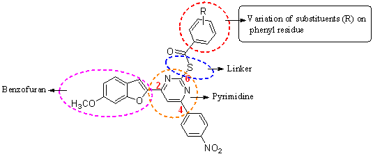 Fight against the microbes is never ending the battle. The harmful microbes poses the biggest problem in the society as far as health and hygiene is concerned [19]. As the resistance to antimicrobial agents increasing day by day, it is very necessary to synthesize new compounds which will show less bacterial resistance and good inhibitory activity. In view of the importance of benzofuran and pyrimidine fragment and also due to our research interests in synthesis of biologically active heterocycles [20-21], we envisioned that, the design and synthesis of benzofuran fused C-2,4,6-substituted pyrimidine derivatives (fig. 1) by introduction of a benzoyl moiety to the pyrimidine S-H (4) scaffold might form a novel series of microbial inhibitors with improved potency and selectivity. Herein, we report the detailed synthesis and evaluation of antibacterial and antifungal activity of these compounds.