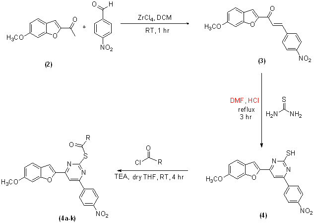 Scheme 1 and 2 illustrate the synthetic pathway to benzofuran fused C-2,4,6-substituted pyrimidine derivatives. Preparation of compounds was started from the methoxy-salicylaldehyde (1) that underwent cyclo condensation reaction with chlroacetone in DCM at room temperature by using DBU as the base thus obtaining intermediates 1-(6-methoxy benzofuran-2-yl) ethanone (2) [24]. Chalcone was synthesized from the (2) with nitro benzaldehyde by Claisen-Schmidt condensation under zirconium chloride as a catalyst thus yielding (3) [25]. Generally, chalcones are considered to be useful intermediate in several cyclisation reactions to produce types of heterocyclic compounds of diverse biological importance, according to the reactants used and the reaction conditions [26]. Construction of the 4-(benzofuran-2-yl)-6-(4-nitrophenyl) pyrimidine-2-thiol (4) was achieved by cyclization of compound (3) with thiourea following a Keri protocol [27]. The moderate yield obtained with the used Keri protocol was considered acceptable for our purposes. Finally, the target compounds (4a-k) were obtained by coupling of commercially available benzoyl chlorides fragments to compound (4) contain linker bond S-H. According to this, 4-(benzofuran-2-yl)-6-(4-nitrophenyl) pyrimidine-2-thiol was coupled with various substituent’s containing benzoyl chlorides, under basic conditions and conversion of the corresponding benzofuran fused C-2,4,6-substituted pyrimidine derivatives (4a-k) and reported in table 1. The structures of the compounds were elucidated by IR, 1H NMR, 13C NMR, mass and elemental analysis.
