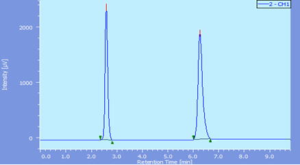 Fig. 1: It shows representative chromatogram obtained for standard mixture of OLME (10 μg/ml, 2.47 min) and CILNI (5 μg/ml, 6.32 min)