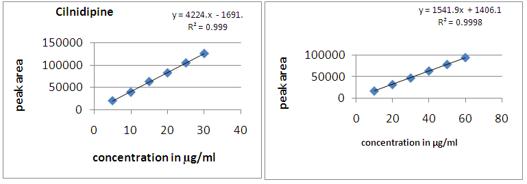 The stock solution of OLME and CILNI was prepared by dissolving 10mg of both drugs in 10 ml methanol separately to obtain a concentration of 1000µg/ml. From this stock solution further dilutions were made in mobile phase to obtain concentrations of 5-30μg/ml and 10-50μg/ml for CILNI and OLME respectively.