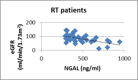 Fig. 1: Correlation between serum NGAL, and eGFR (r =-0.39, p<0.05) in RT patients