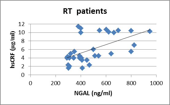 Fig. 2: Correlation between serum NGAL, and hsCRP (r = 0.43, p<0.01) in RT patients