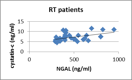 Fig. 3: Correlation between serum NGAL, and Cystatin-c (r = 0.39, p<0.05) in RT patients