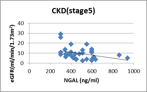 Fig. 4: Correlation between serum NGAL, and eGFR (r =-0.35, p<0.01) in CKD patients (stage 5)