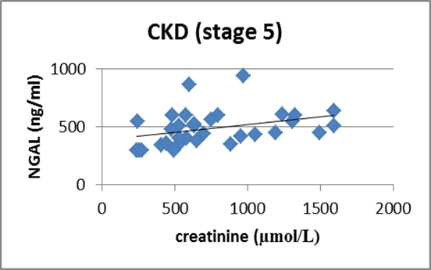 Fig. 5: Correlation between serum NGAL, and creatinine (r = 0.35, p<0.05) in CKD patients (stage5)